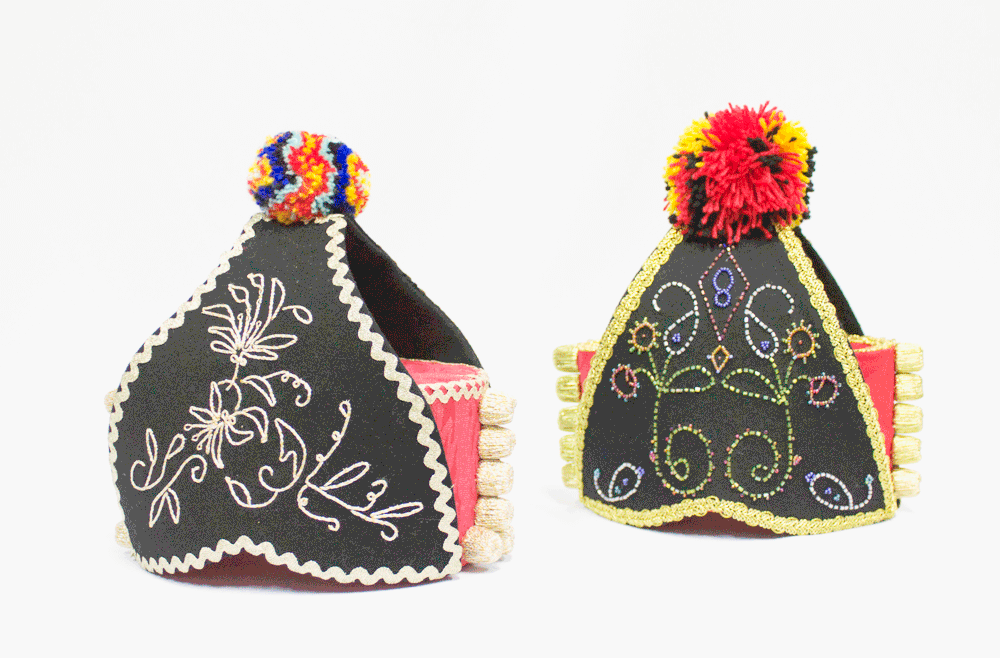 Montera en terciopelo negro con bordadura en los laterales, decorada con lentejuelas de metal y la borla de seda e hilos metálicos. Obsérvense los apóstoles hechos de madera maciza y forrados con hilos metálicos